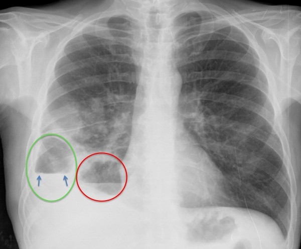 En la placa PA, se observa un encapsulado pleural (verde) y una cavidad parenquimatosa (roo), ambas con nivel hidroaéreo. En el pleural, obsérvese la discordancia del nivel (flechas), tanto en longitud como en densidad, entre las dos proyecciones y borramiento de la pared superior y más posterior en la placa lateral. En la cavidad parénquimatosa, se conserva la misma forma y densidad en las dos proyecciones, con delimitación del controno superior de su pared.