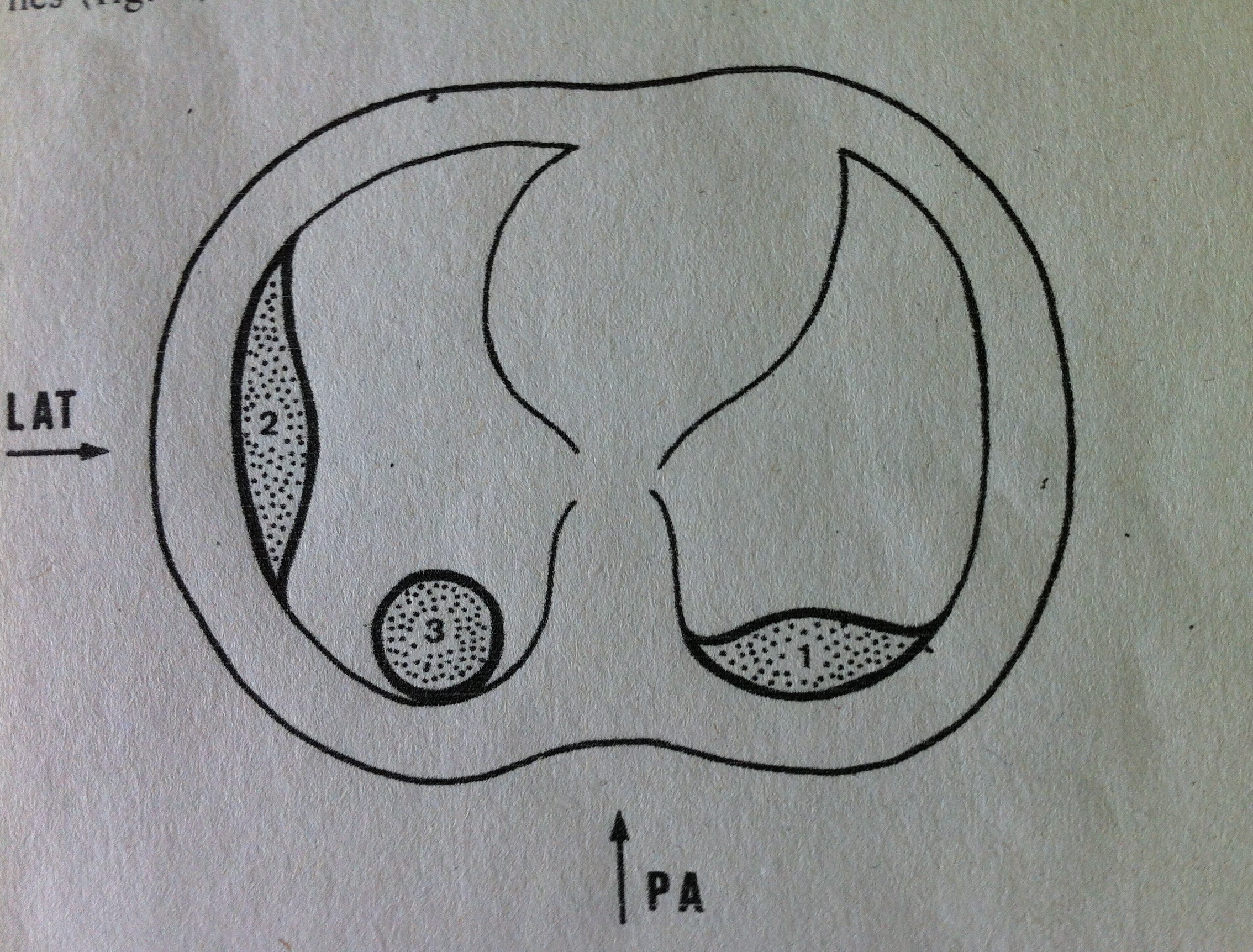 Esquema 1. Sección Transversal de tórax en la que se representa la configuarción lenticular del encapsulado pleural en localización posterior (1) y (2) y la morfología redondeada que adopta una lesión intrapulmonar (3). Un nivel hidroaéreo en (1) y (2) mostrará una discordancia en tre sus dimensiones en P.A y lateral. En (3) el nivel será igual en cualequiera de las dos proyecciones.