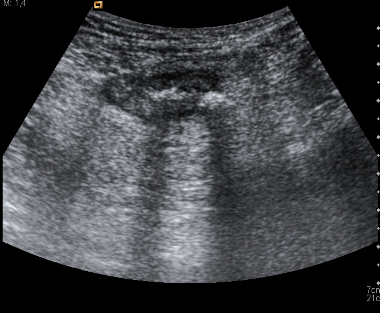 ECOGRAFÍA DE ABDOMEN: Engrosamiento mural a nivel de sigma, con presencia de divertículos y discreta hiperecogenicidad de la grasa adyacente. Se observan dos focos brillantes hiperecogéncios con sombra acústica sugerentes de fecalitos. Estos hallazgos son compatibles con diverticulos inflamados con fecalitos en su interior.