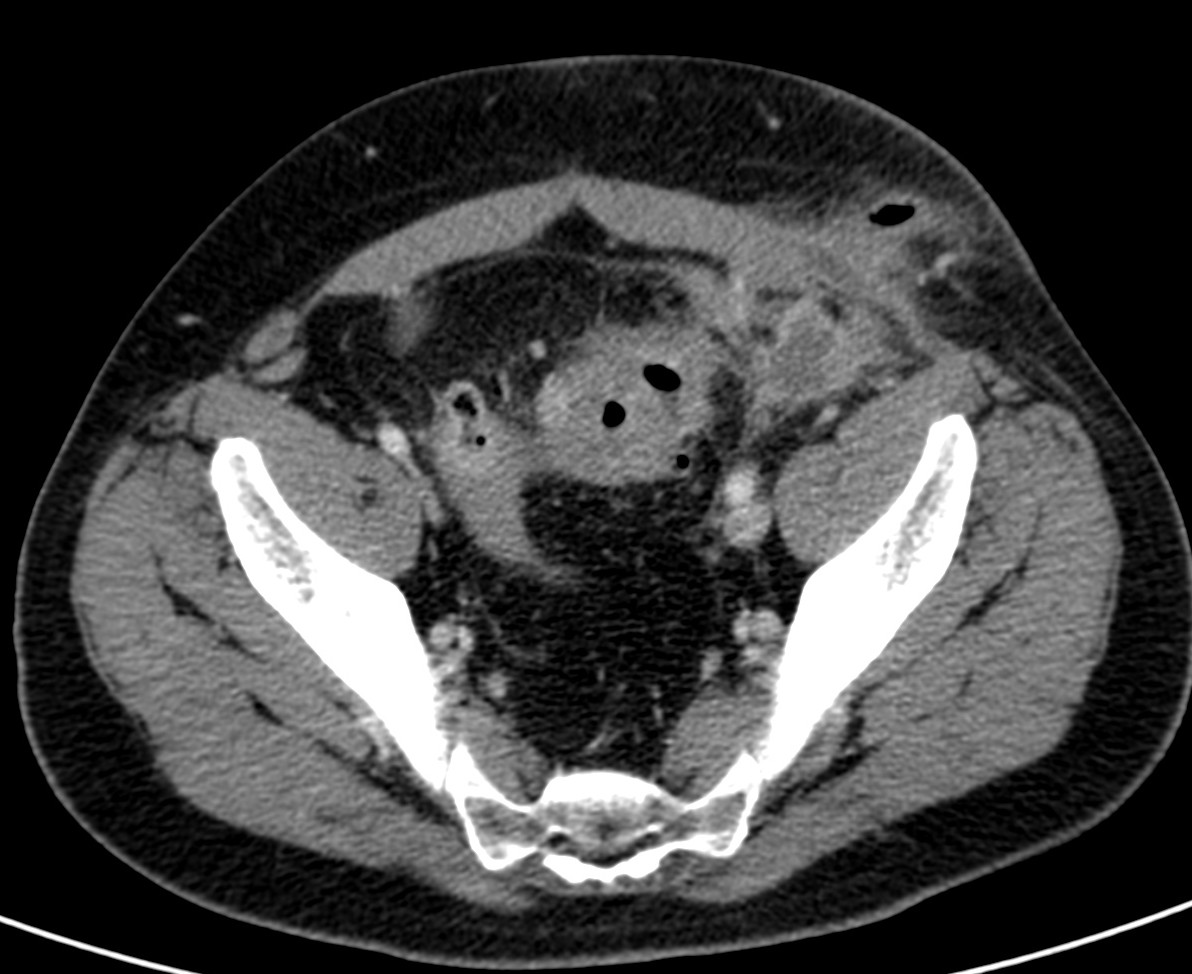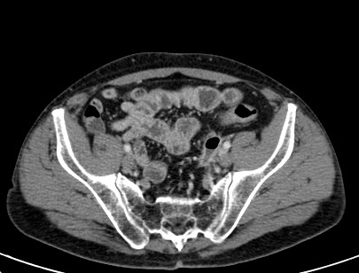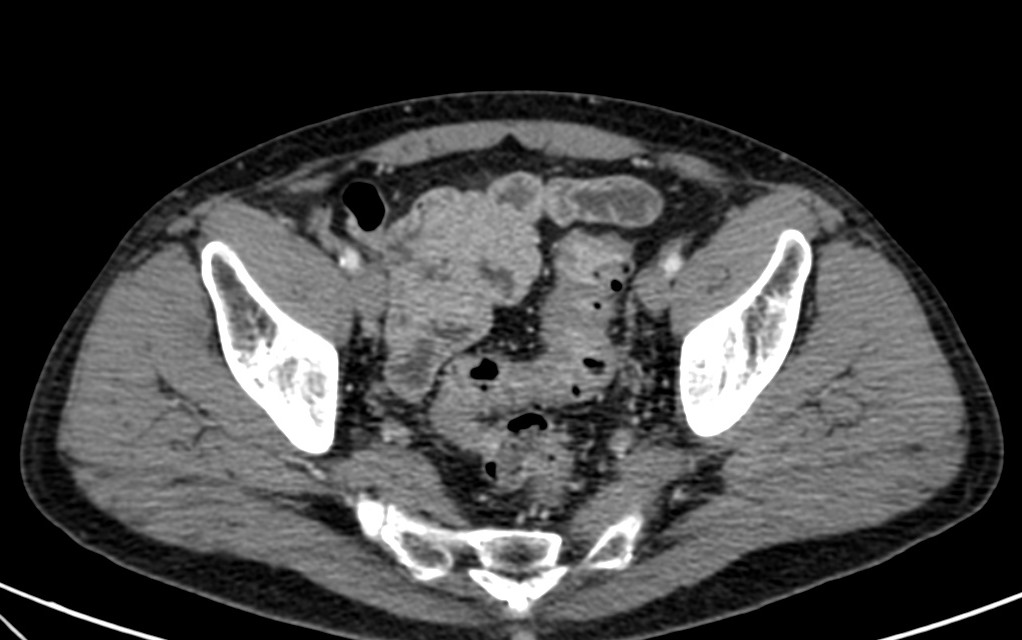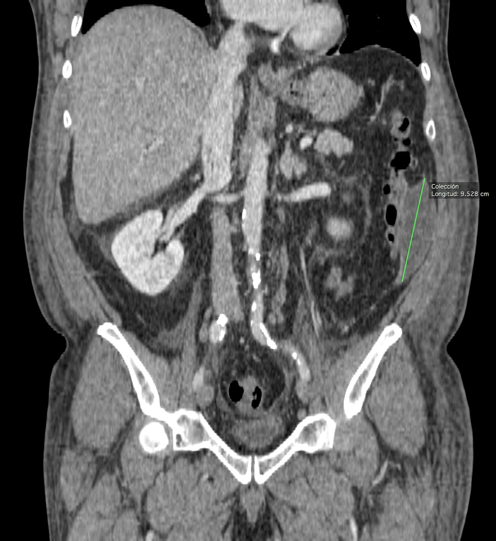 Paciente varón de 50 años que acude a urgencias por dolor con AP de enfermedad de Crohn. Desde primera hora de la tarde presenta dolor abodminal en FII, con irritacion peritoneal a dicho nivel. Fiebre de 39 ºC.