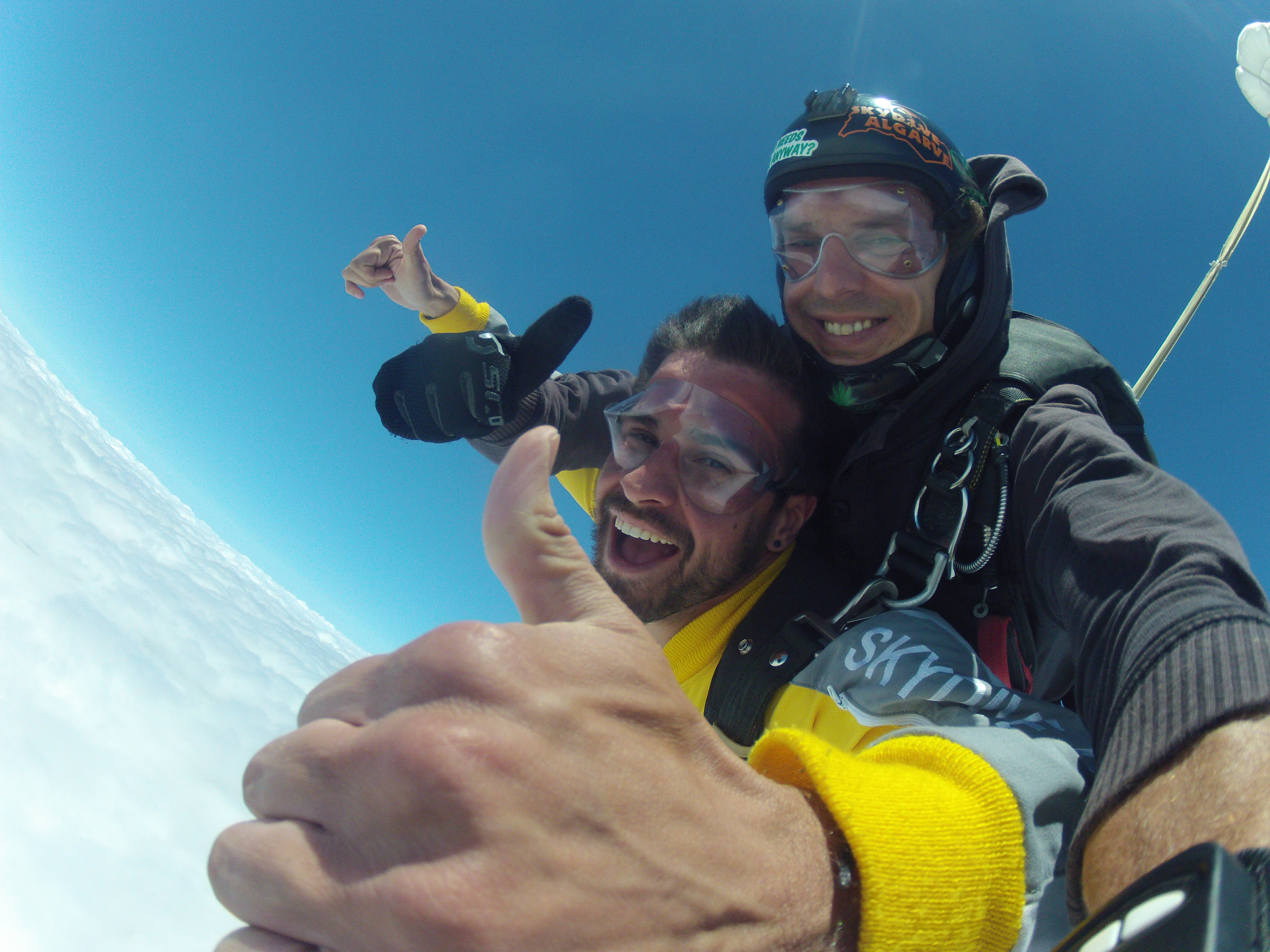 Estos tipos han hecho esto mil veces, 5800 y pico concretamente el tipo que llevo a la espalda… Los instructores parecen gente que sube al cielo como quien va a comprar el pan, está todo controlado, todo es simplemente rutina surgida de la transformación de una situación de riesgo la cual ha sido domada por expertos, pero las catástrofes ocurren. Ejemplos muchos: el accidente del Challenger de la NASA, el Concord, el AVE de Galicia… ¡Joder! La NASA, ahí hay muchos expertos y mira… Creo que no es momento de pensar estas cosas… «Dos minutos y abrimos la puerta», se escucha. ¿Y ahora qué?.. Con la puerta de la avioneta abierta, a más de tres mil metros, los pies apoyados en una plataforma minúscula, visualizando tamaño paisaje, el aire azotando con fuerza y el pago realizado… ¿te vas a echar atrás? Mira que te puedes morir… Es impresionante aguantar unos segundos ahí fuera viendo semejante altitud, son muchos metros hasta el suelo y ahora me da la risa, le sonrío a la cámara y con un salto mortal me precipito al vacío a 220 km/hora, 50s de caida libre, el pecho comprimido por la fuerza del aire y la sensación que no se puede explicar con palabras en mi cuerpo: estoy cayendo al vacío.