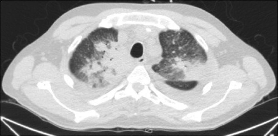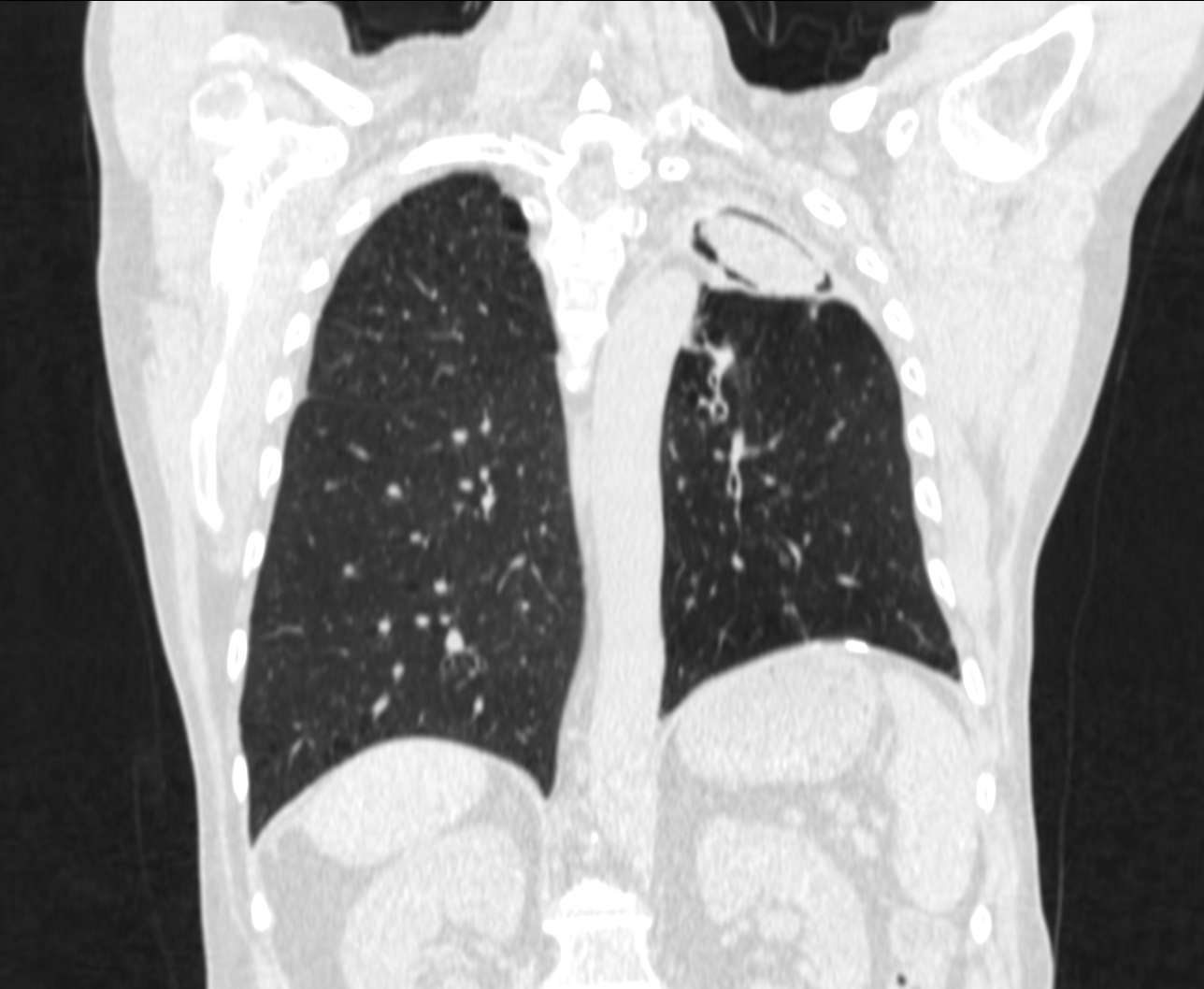 Paciente de 69 años al que se le realiza un estudio programado de TAC por presentar hemoptisis ocasionales. No refiere alteración del estado general, no sd constitucional, IMC 26. En la placa de tórax se observó una masa en LSI.