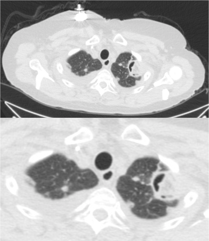 Por tanto, estamos ante un colapso crónico del LSI con lesión cavitada ocupada en su interior por una imagen redondeada compatible con Aspergiloma que podría ser el responsable de las hemoptisis ocasionales que presenta el paciente.