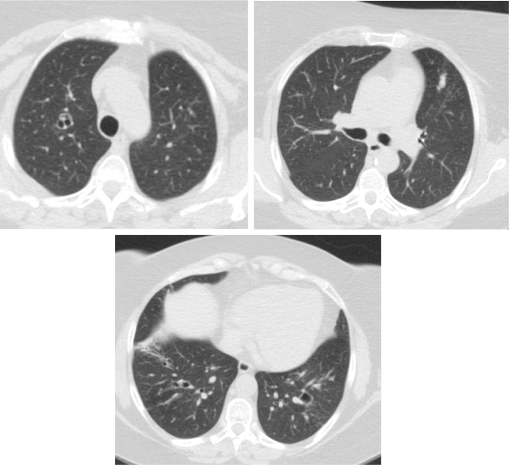 Hallazgos radiológicos: Opacidades en dedo de guante en placa simple, Impactos mucoides en bronquios segmentarios y subsegmentarios sobre todo en lóbulos superiores en TAC, Atelectasias aisladas segmentarias, Bronquiectasias, Calcificaciones (30%). Hacer diagnóstico diferencial con otras etiologías como la atresia bronquial, lesiones bronquiales o bronquiectasias.
