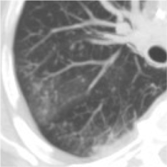 Hallazgos radiológicos: La placa simple puede ser normal o presentar engrosamiento bronquial y traqueal. En el TAC: En la bronquiolitis, vemos microndódulos centrolobulillares con ramificaciones lineales dando patrón en árbol en brote de distribución parcheada (Diagnóstico diferencial con TBC, MAI, mycoplasma). En la bronconeumonía, consolidaciones peribronquiales (hallazgo inespecífico).