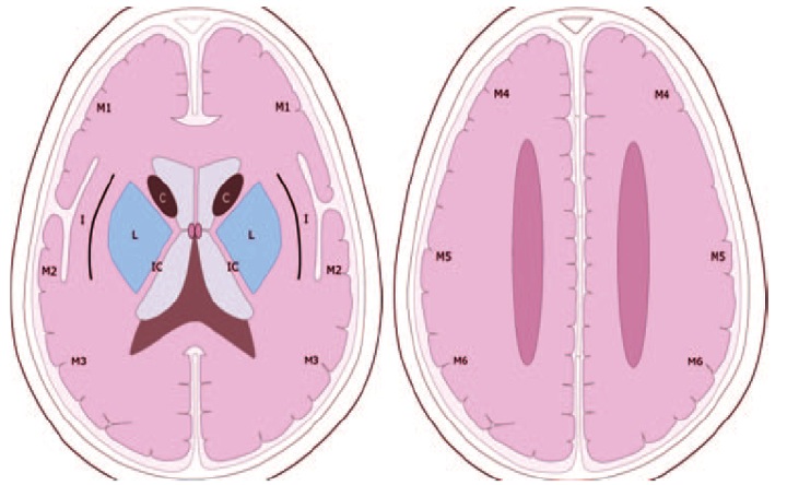 - En los dos planos, el territorio de la arteria cerebral media se divide en 10 regiones, valorando cada una en 1 punto.