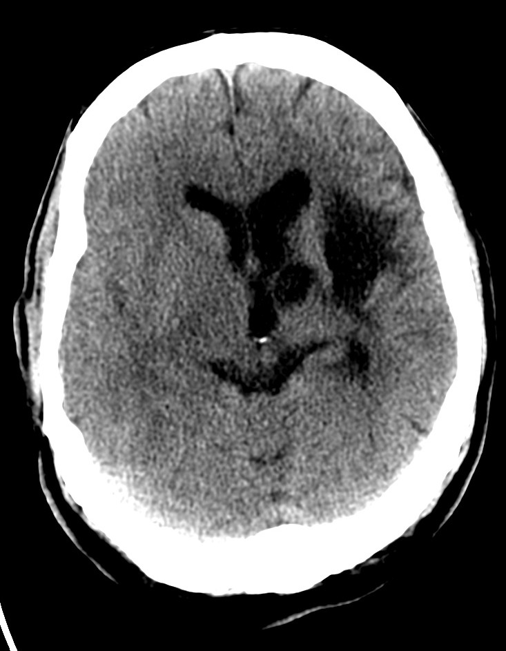 Paciente con alteraciones del habla y disminución de la fuerza del brazo izquierdo. Ictus previo hace 4 años.