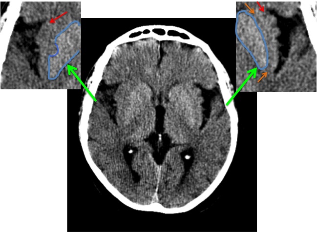 3- Pérdida de la diferenciación del núcleo Lenticular: Puede darse tras 2 horas del inicio. El núcleo Lenticular aparece más oscuro debido al edema citotóxico que se produce tras la lesión por isquemia neuronal.