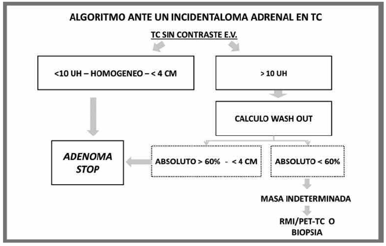 Lo ideal sería hacer un TC sin contraste y analizar las caracteríticas de la lesión. Si es una lesión homogénea, pequeña (<4 cm) y con contenido lipídico (<10 UH) los hallazgos son muy E para adenoma. En caso contrario, realizamos estudio con contraste (Vacío + Portal + Tardío a los 7-10 min), medimos la densidad con ROI y aplicamos las fórmula Washout.