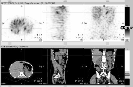 Paciente de 56 años en el que se descubre una masa suprarrenal derecha de 4,1  x 2.8 cm aprox., al realizar un TC de abdomen por otro motivo. Se procede al diagnóstico y caracterización de dicha lesión en la glándula suprarrenal derecha.