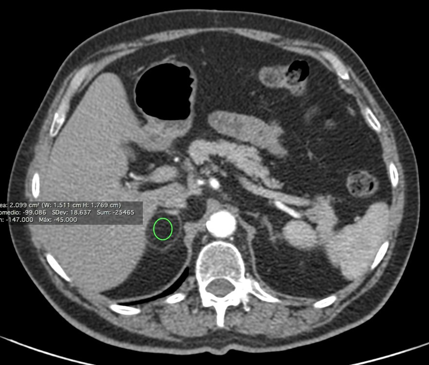 FASE PORTAL. ROI 54,8 HU. Se observa como las unidades Hounsfield han aumentado, indicativo de que la lesión se ha impregnado de contraste.