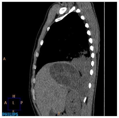 Elevación del hemidiafragma derecho una lesión quistíca de gran tamaño en segmento VII que continua con el segmento VI. Que pierde plano de clivaje con espacio pararrenal anterior