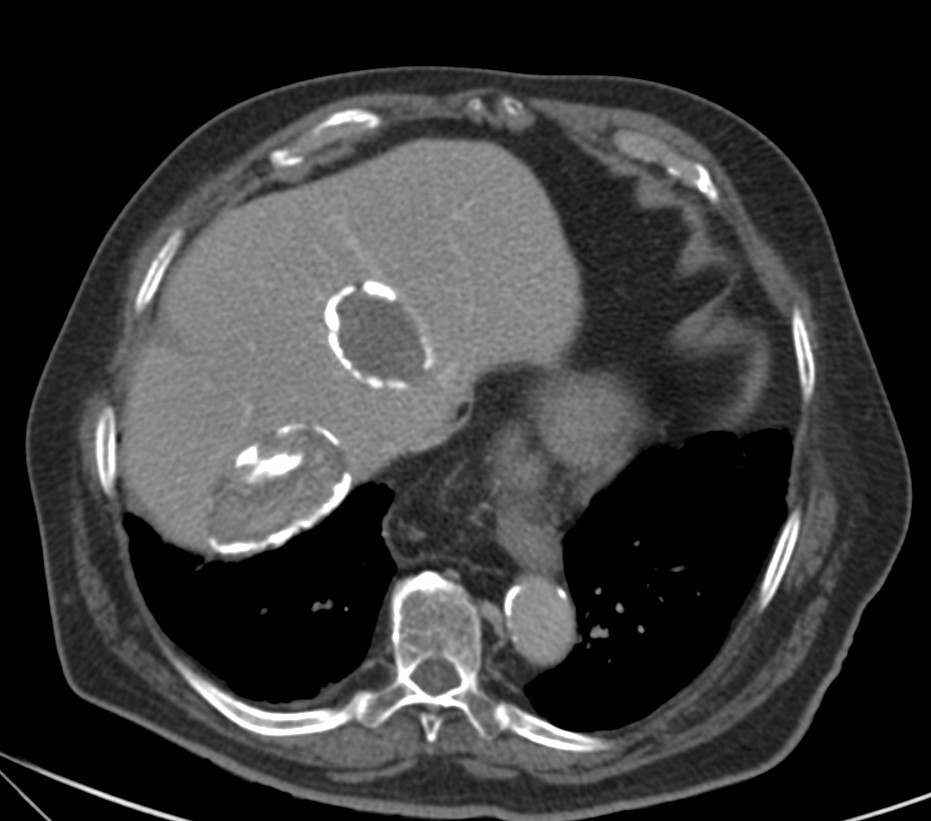 - TC: Tiene mayor S y E para la valoracion del quiste hidatídico. Se usa cuando la ecografía no nos proporciona un resultado óptimo por obesidad, interposición de gas, cambios postquirúrgicos en la pared abdominal, deformidades, etc… La administración de contraste no es necesaria a menos que se sospechen complicaciones, especialmente la infección o la comunicación con la vía biliar. Los hallazgos por TC son similares a los de ultrasonido, como son la densidad líquido en el interior del quiste, vesículas hijas en la perifería del quiste mayor o madre o calcificación de pared. La pared del quiste muestra alta atenuación inclusive sin contraste y sin calcificación.