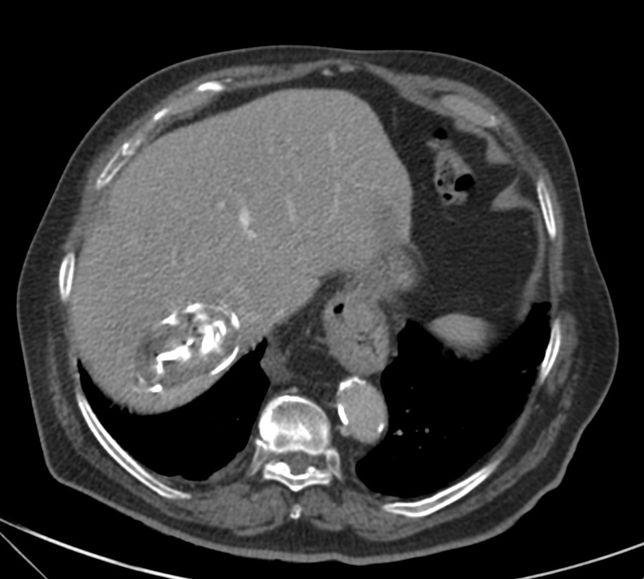 Estamos presenciando el lugar de afectación más frecuente de la Hidatidosis, el Hígado, concretamente sería el lóbulo hepático derecho, el cual se ha abierto al hemitórax derecho por una rotura directa.