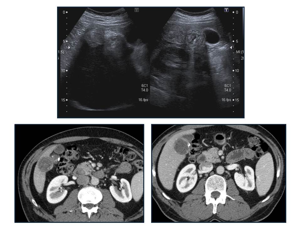 La SOBREINFECCIÓN ocurre tras la ruptura del endoquiste y periquiste (rotura directa y comunicante), que permite que las bacterias accedan a su interior. Se producirá un absceso que puede ser demostrado por US o TC. Los hallazgos ecográficos son variables, puede mostrar una masa de ecogenicidad heterogénea, con componente sólido o mixto (sólido – líquido) , presencia de gas, márgenes poco o bien definidos, etc… . La TC es la técnica de elección para ver el absceso. En la TC sin contraste veremos una masa mal definida y en la TC con contraste podemos ver el típico realce en anillo del absceso. También podría indicarnos la presencia de gas o niveles de líquido.