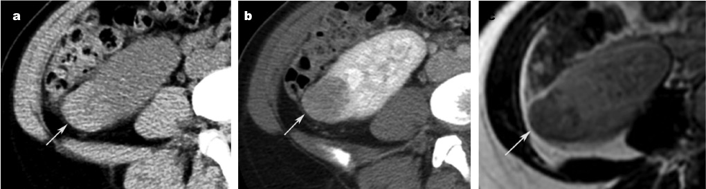 Destacar con rotundidad, que si nos piden un TC para para descartar un CCR, hay que hacer un ADECUADO PROTOCOLO DIAGNÓSTICO con varias fases para observar el comportamiento de realce de la lesión. Esto es básico, de no hacerlo estamor incurriendo en una mala práctica radiológica. Si luego tenemos la suerte de encontrar grasa macroscópica, mejor para el diangóstico de beningnidad. Si ese no fuera el caso, podemos recurrir a la realización de una RM o incluso una biopsia antes que mandar directamente a quirofano a un paciente de manera innecesaria.