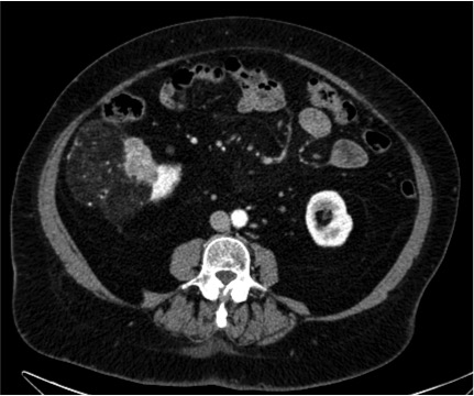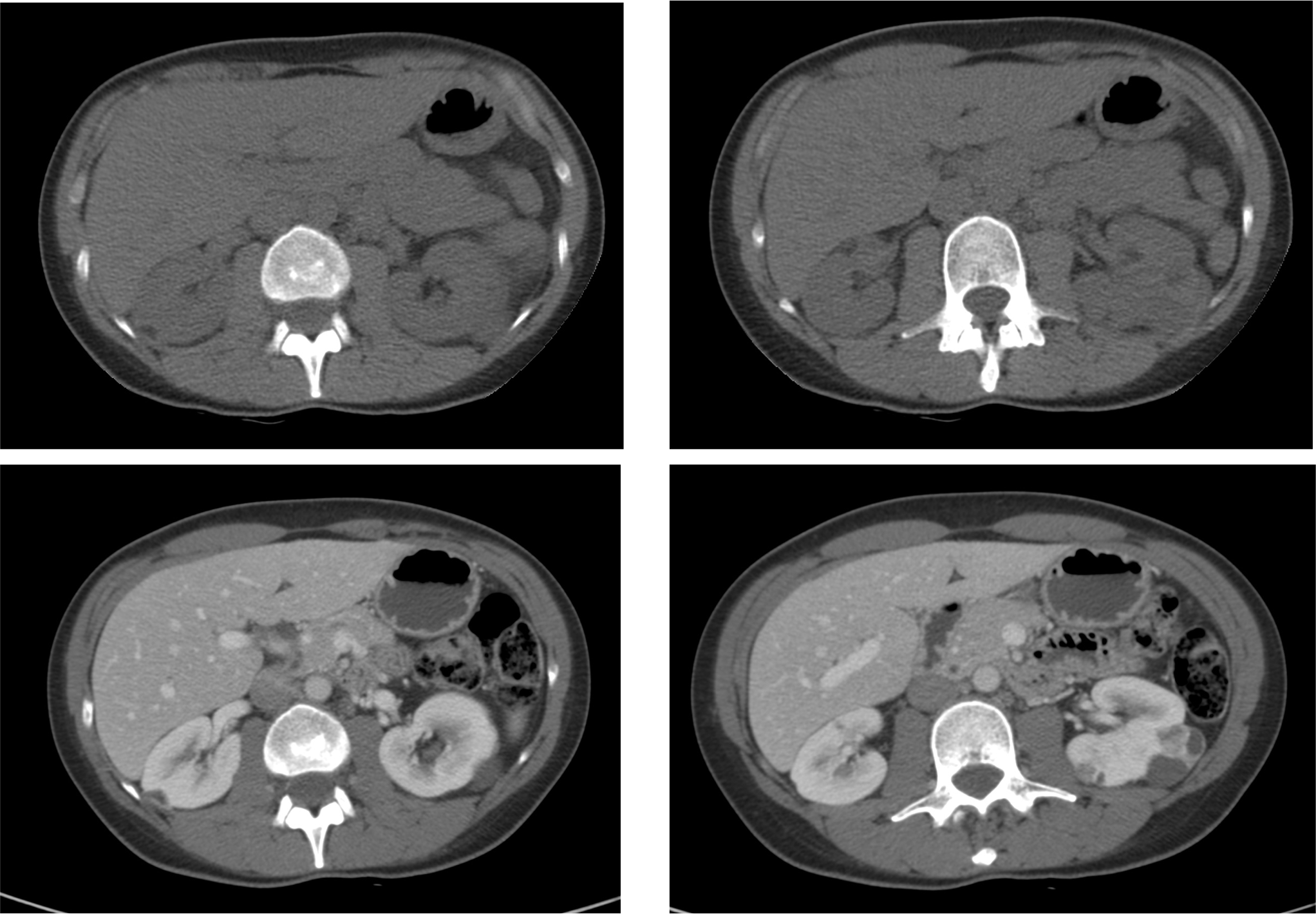 Tras los hallazgos descritos, debemos descartar el tumor sólido maligno que más frecuentemente afecta al riñón del adulto, el Carcinoma de Células Renales (CCR), versus el tumor benigno más frecuente que afecta a dicho órgano, el Angiomiolipoma Renal. Para ello, se realizó un TAC abdominal.