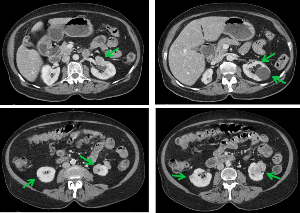 - Metástasis: Estadísticamente, es el tumor más frecuente en el riñón. Proceden de tumores primarios como el pulmón, mama, gastrointestinal y melanoma. En CT veremos que las metástasis son típicamente pequeñas, multifocales, bilaterales y exhiben un patrón de crecimiento infiltrante. La captación de contraste es menor que el resto del parénquima renal