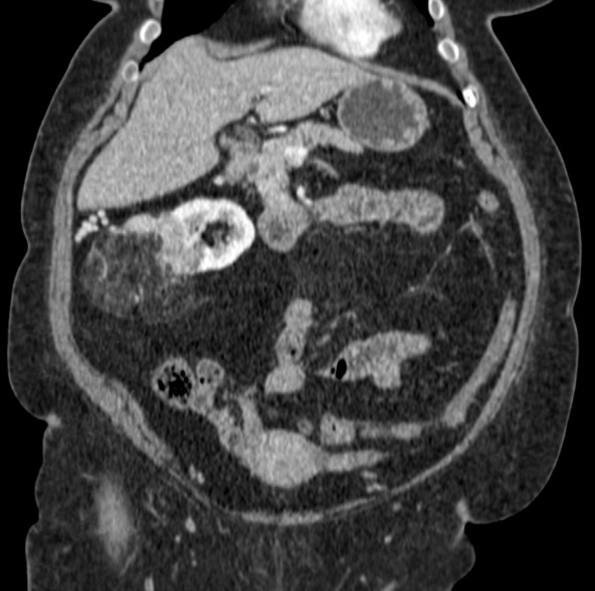 Como se explica en la imagen presentada, además de los multiples AML bilaterales, existe la enorme lesión que engloba el riñón derecho, la cual también contiene grasa macroscópica. Se trata de un angiomiolipoma renal GIGANTE que media casi 25 cm de largo. Esto viene a reforzar el concepto de que el tamaño per se no es un criterio de malignidad.
