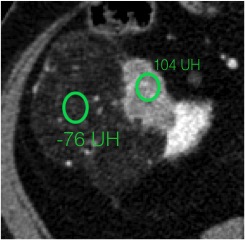 - TC: la presencia de ROI (region of interest) con atenuaciones inferiores a – 10UH permite un diagnóstico de certeza del AML. Cuando analizamos AML con poca cantidad de grasa, la adquisición con cortes finos (1.5-3mm) son necesarios usando medidas con ROIs pequeños para detectar grasa que de otro modo no se podría valorar debido al volumen parcial. Hay que tener en cuenta que las mediciones con ROI pueden verse sesgadas en caso de hemorragia, ya que se elevan los indices de atenuación por la sangre.