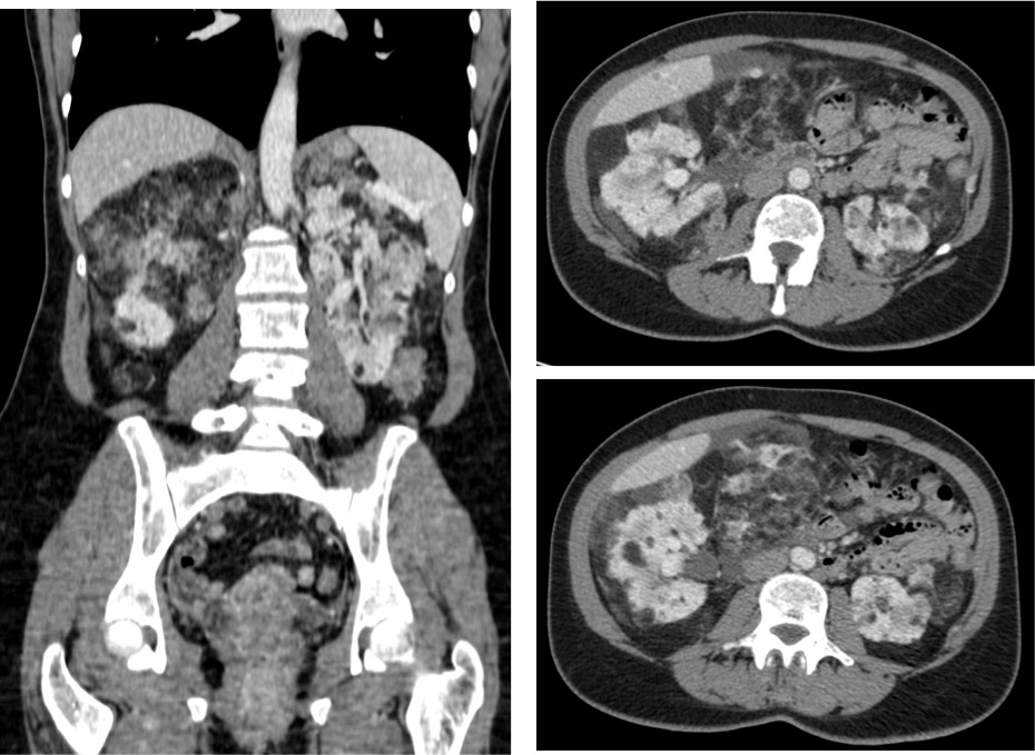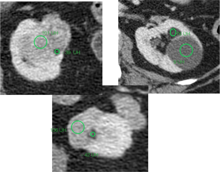 Existe lesiones con alta atenuación que nos podrían confundir con un CCR. Sin embargo, tras realizar múltiples ROI, vemos que hay zonas con densidad negativa, indicativa de grasa macroscópica. Esto de por sí ya es suficiente para el diagnóstico de angiomiolipoma renal. Pero además, las lesiones son múltples y bilaterales, lo cual es muy infrecuente en el CCR y nos refuerza más aun el diagnóstico de AML.