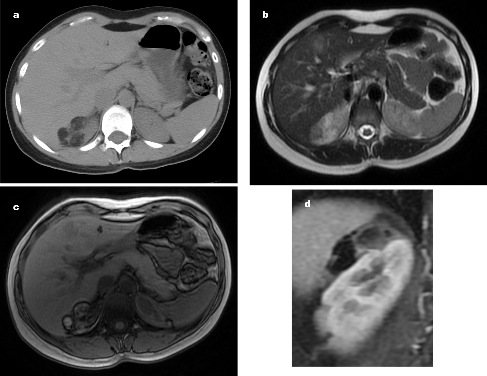 - RIÑÓN DERCHO: Vemos com la lesión tiene grasa macroscópica en el TC con contraste, diangóstico de Angiomiolipoma. En la RM, vemos como en T2 la grasa brilla, es hiperintensa (a); en secuencia Fat – Sat hay supresión de la grasa (b); La lesión muestra aumento de señal y caida de la misma en Fase – Fase Opuesta (c y d). Además vemo como en Fase Opuesta (d) se produc el fenómeno de tinta china que froma un anillo alrededor de la lesión. Todos estos hallazgos son indicativo de angiomiolipom renal.