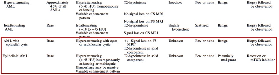 A continuación se presenta una tabla donde se especifican las diferencias radiológicas y patológicas entre los diferentes AML que desarrollaremos paulatinamente.