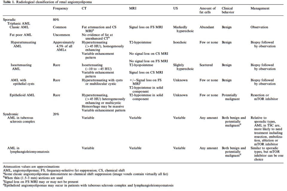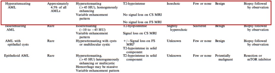 Hasta ahora, hemos hecho más hincapie en describir el angiomiolipoma «clásico», cuyo diagnóstico se suele realizar a través del reconocimiento de la GRASA macroscópica por TC y RM. Sin embargo, con los últimos avances se han descrito otros tipos de angiomiolipomas, por lo que en realidad consituyen un grupo más heterogéno con patología y radiología variables. Así, se han añadido un grupo de angiomiolipomas pobres en grasa, cuya importancia radica que la escasez de lípidos que poseen, hacen que el diagnóstico diferencial con el carcinoma de células renales (CCR) sea más difícil y por tanto pueden confundirnos en el diagnóstico e incurrir en una intervención quirúrgica innecesaria.