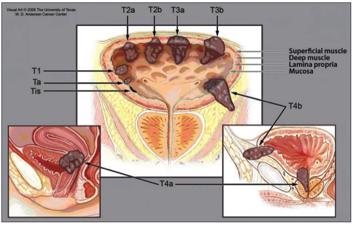 Los tumores T1 invaden la lamina propia, por ello se denominan tumores no músculo-invasivos. Sin embargo, pueden evolucionar hacia invasivos, especialmente los de tipo aplanados y el subtipo Cis. Los tumores T2 son aquellos que invaden las capas superficial (T2a) y profundas del músculo (T2b). Los tumores T3 pueden extenderse micro (T3a) o macroscópicamente (T3b) por toda la pared e invadir la grasa y los tumores T4 son aquellos que invaden órganos vecinos o la pared pélvica.