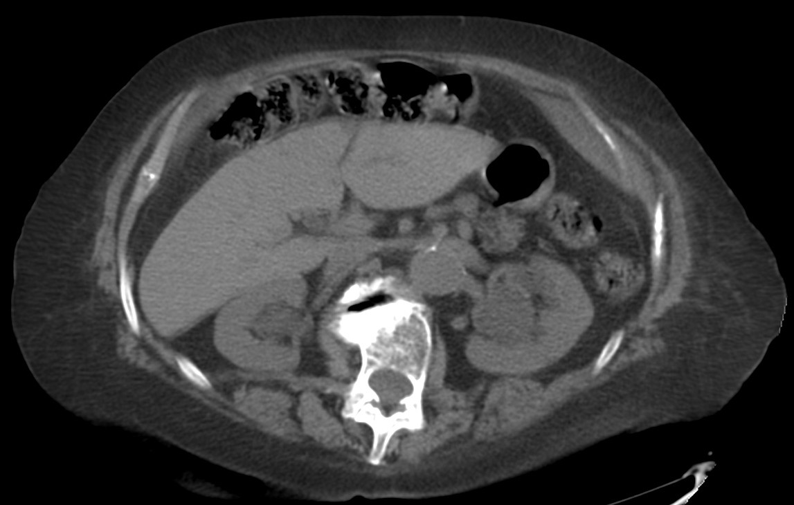 - Múltiples áreas radiolúcidas en el esqueleto visible en relación con lesiones lucentes mal definidas compatibles con metástasis óseas.