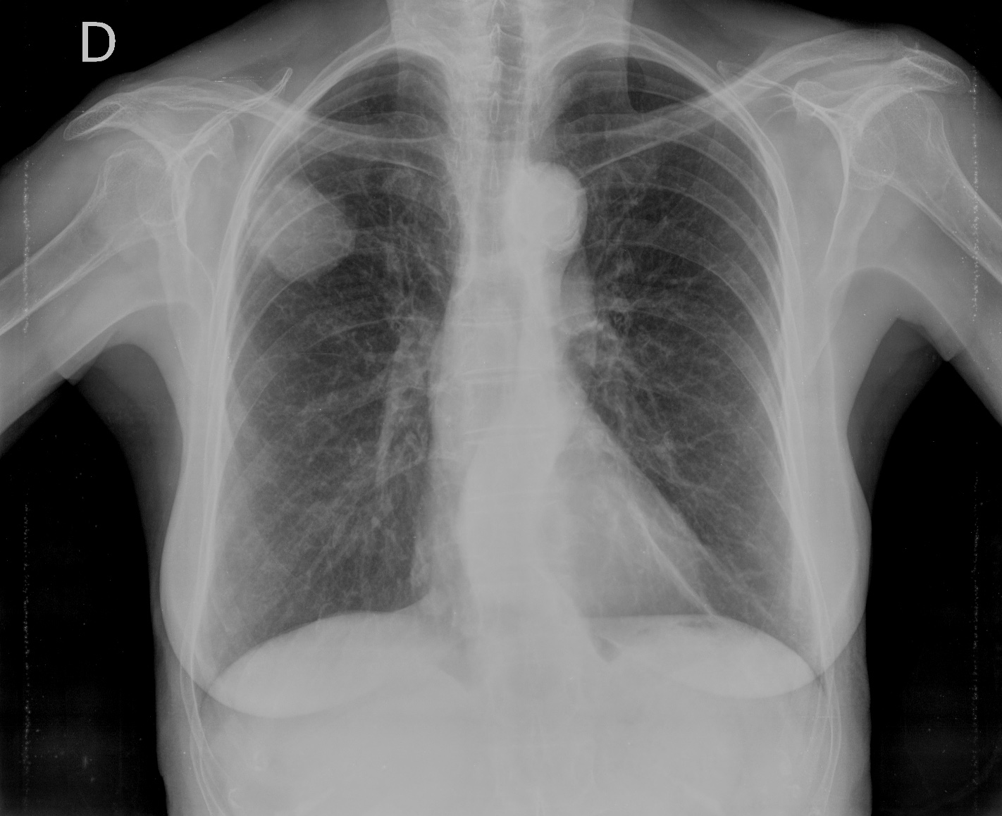 - En el parénquima pulmonare visible parece no existir alteraciones a excepción de una imagen nodular periférica en base derecha. ¿Estamos ante un nódulo pulmonar? Analicemos la radiografía con detenemiento.