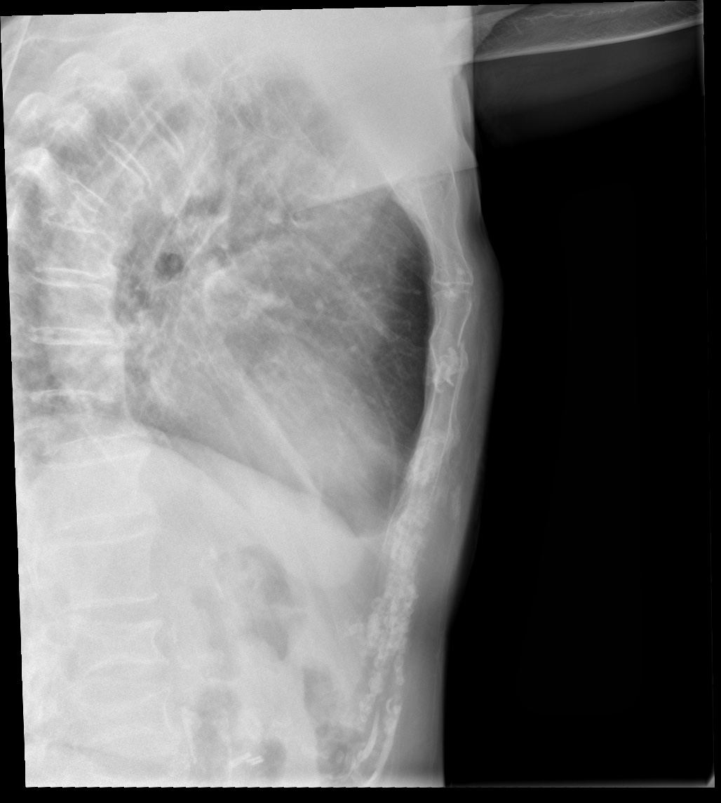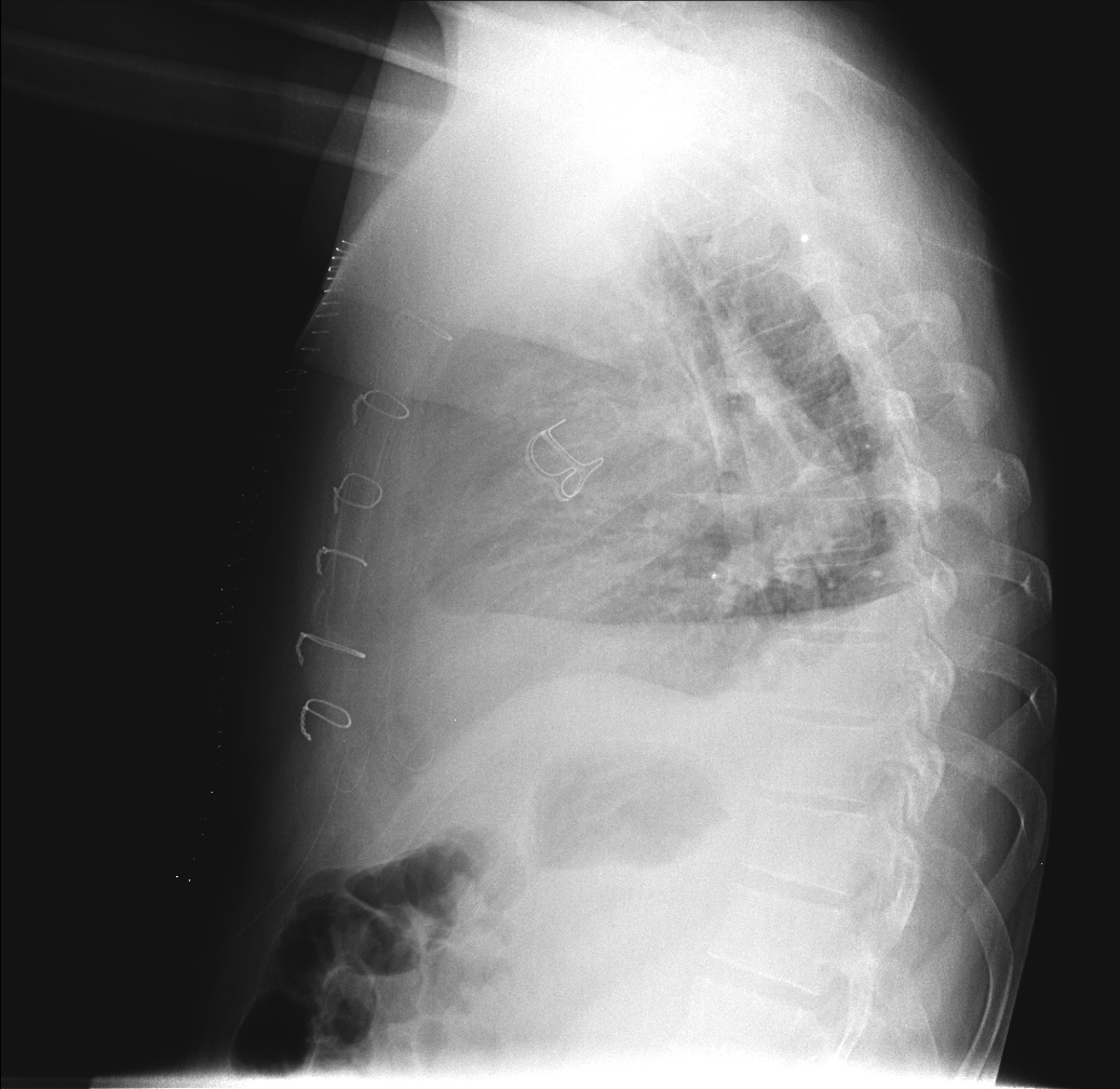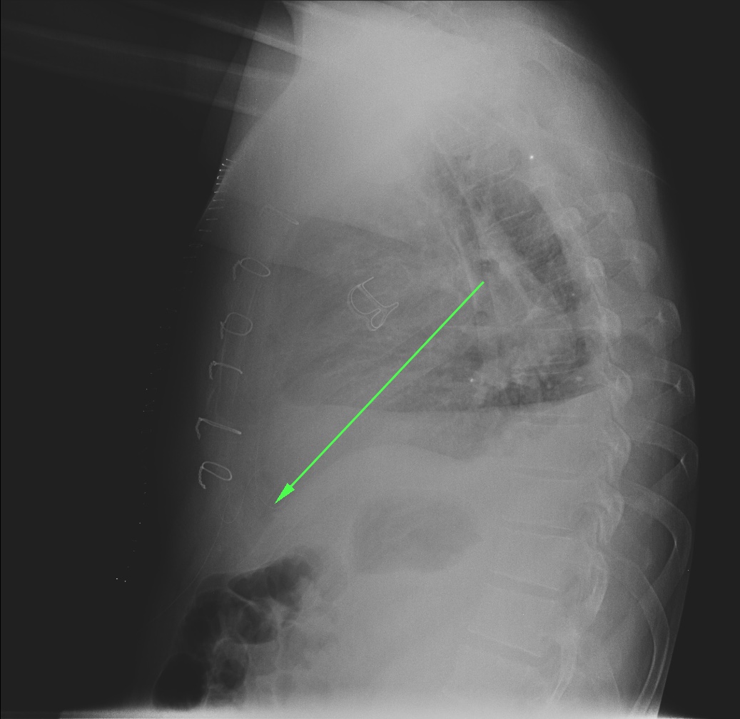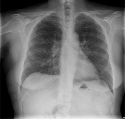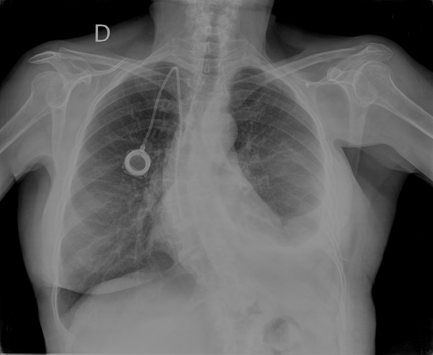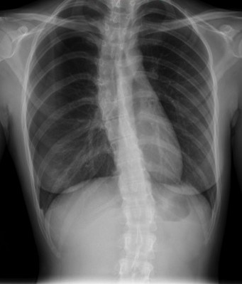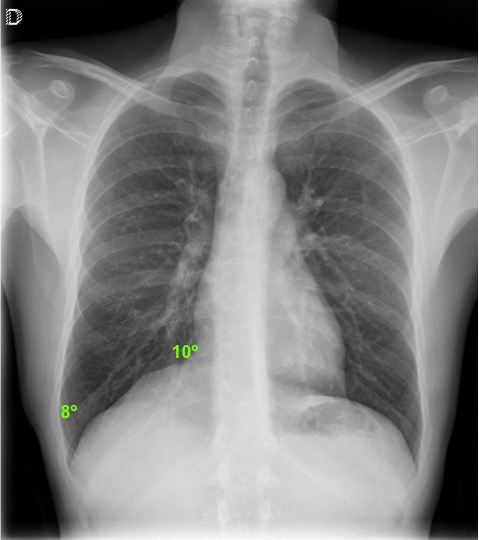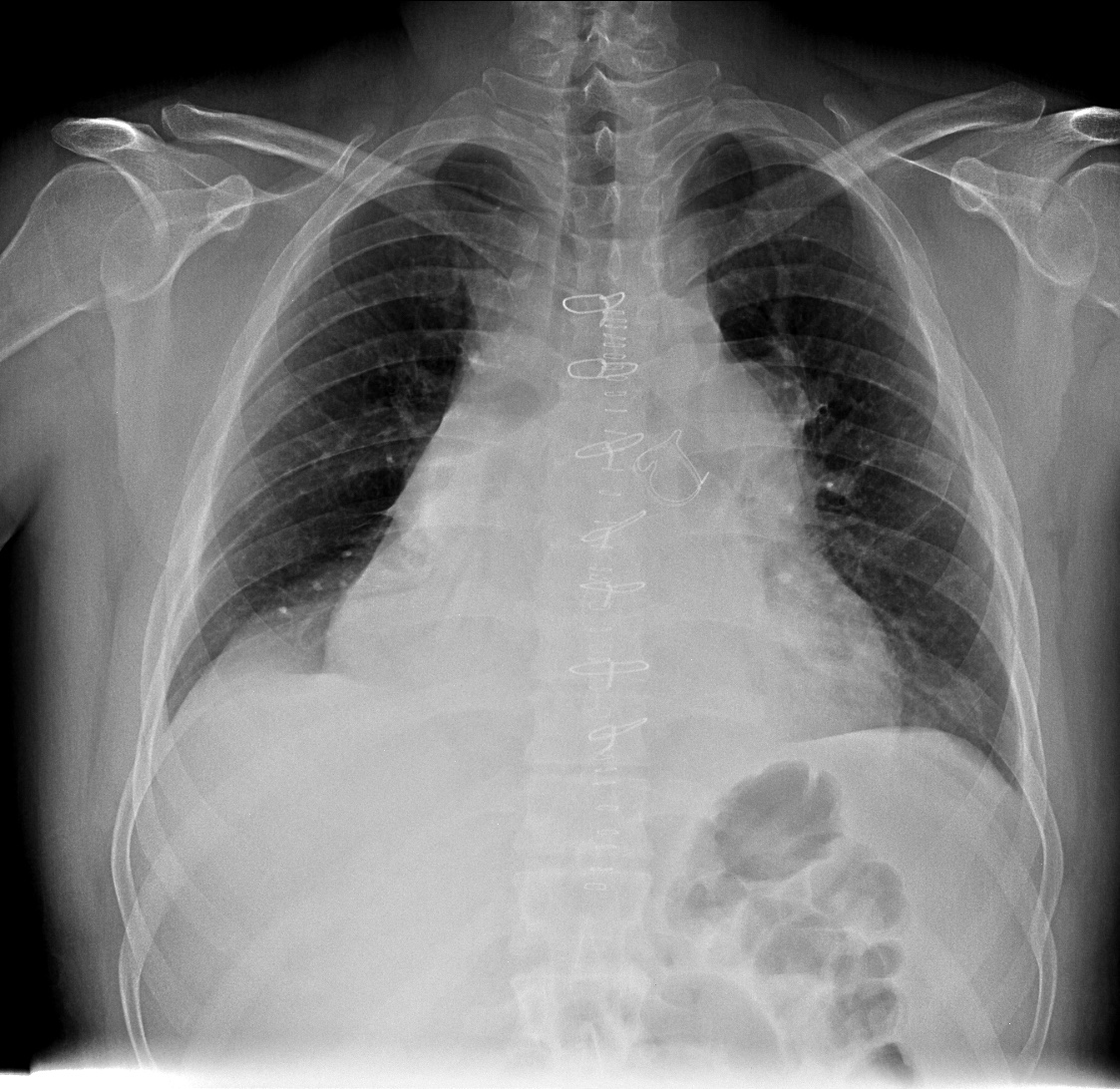 Mismo paciente, al cual esta vez se le ha tomado una radiografía en PA y en sedestación. Observar como las clavículas están equidistantes a las apófisis espinosas y como ha desaparecido el velamiento del pulmón izquierdo.