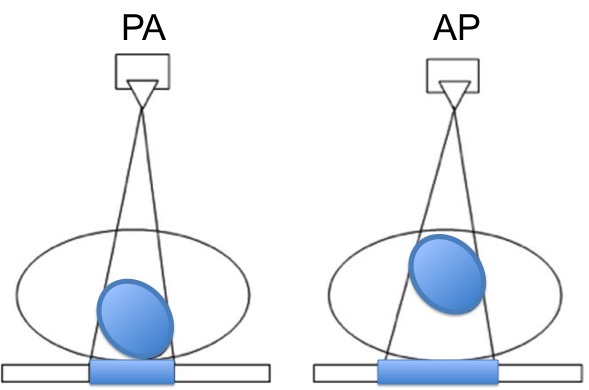 - La posición estándar es PA, de modo que las estructuras mediastínicas (incluido el corazón) quedan más cerca de la placa radiográfica y están menos magnificados. La AP se suele realizar en los pacientes encamados que no puede moverse, como puede ser en la UCI.