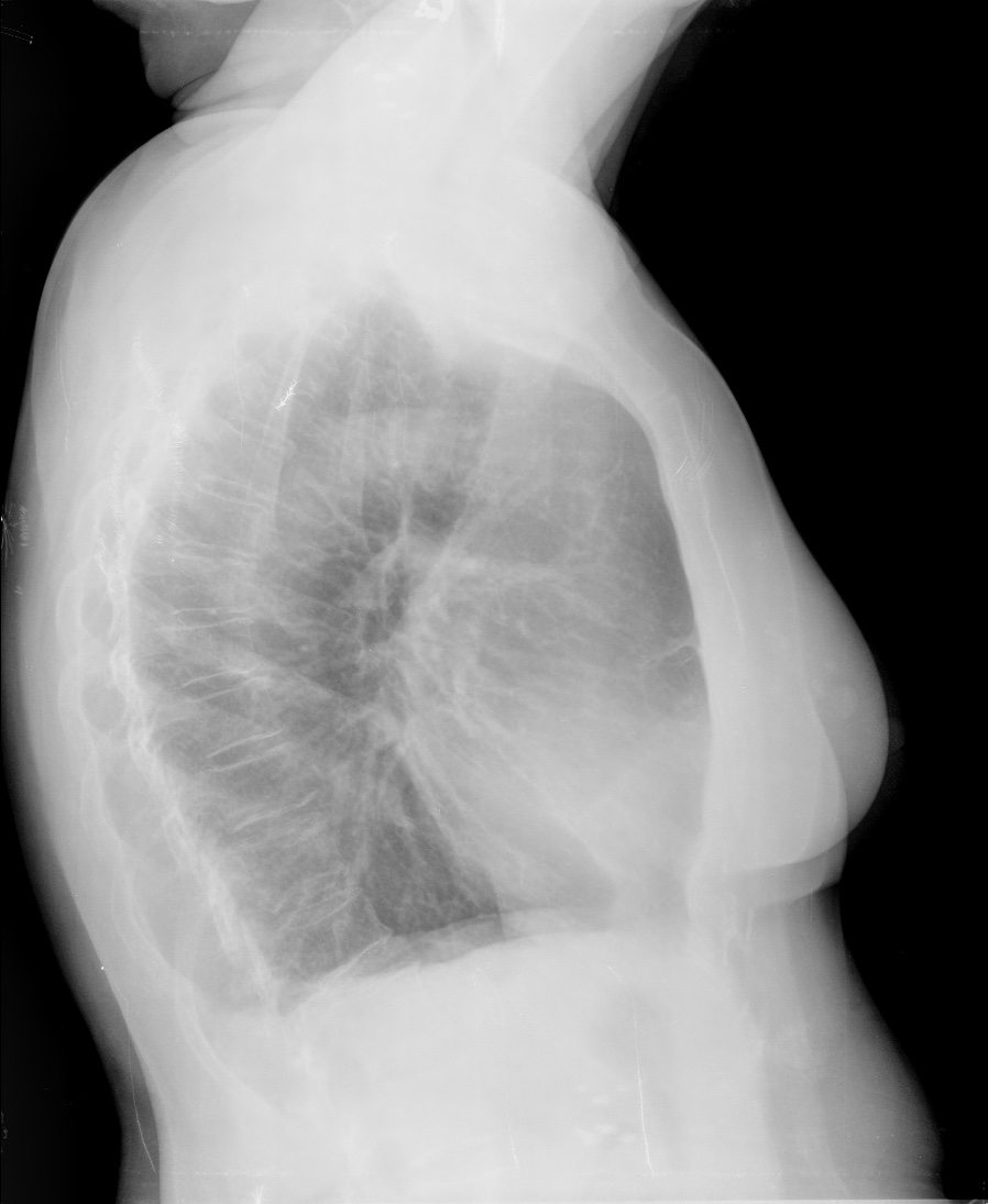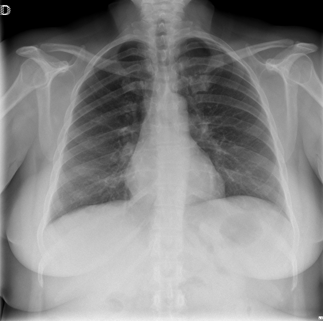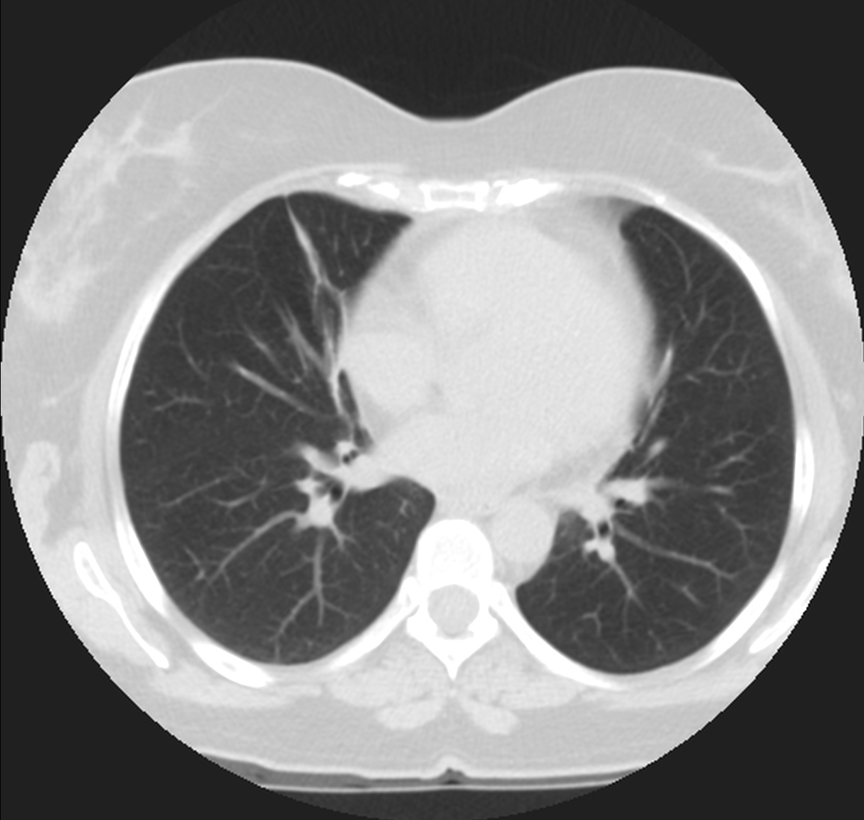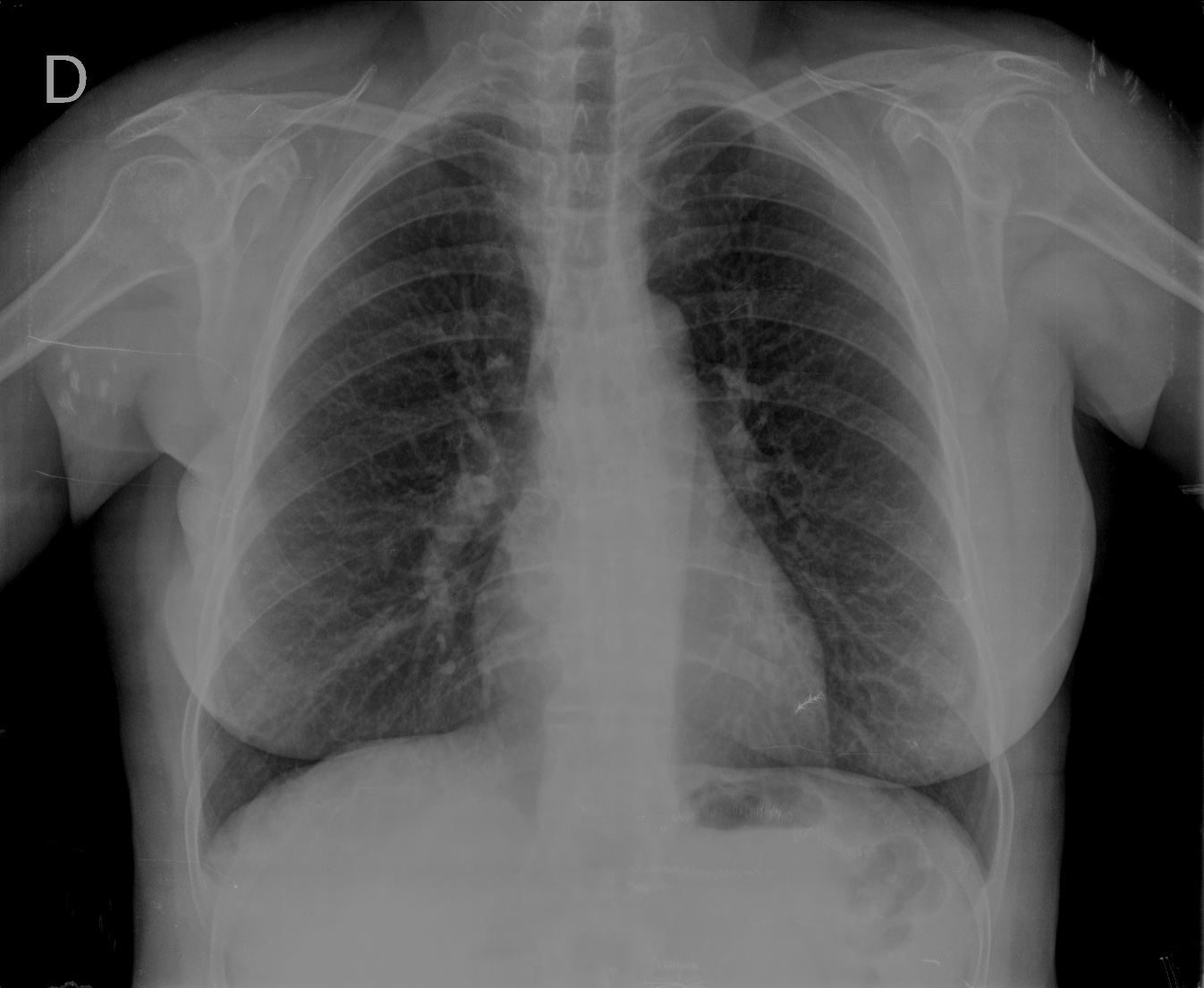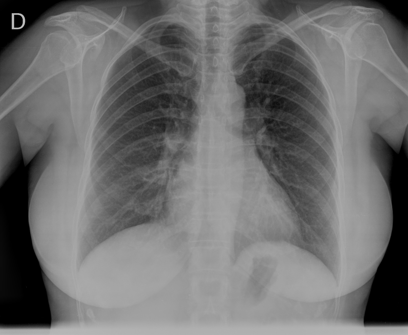 RECUERDA LA SISTEMÁTICA PARA NO OLVIDAR NINGUN HALLAZGO. A esta paciente le han extirpado la mama derecha, motivo por el cual se observa una asimetria entre las densidades de las bases pulmonares.