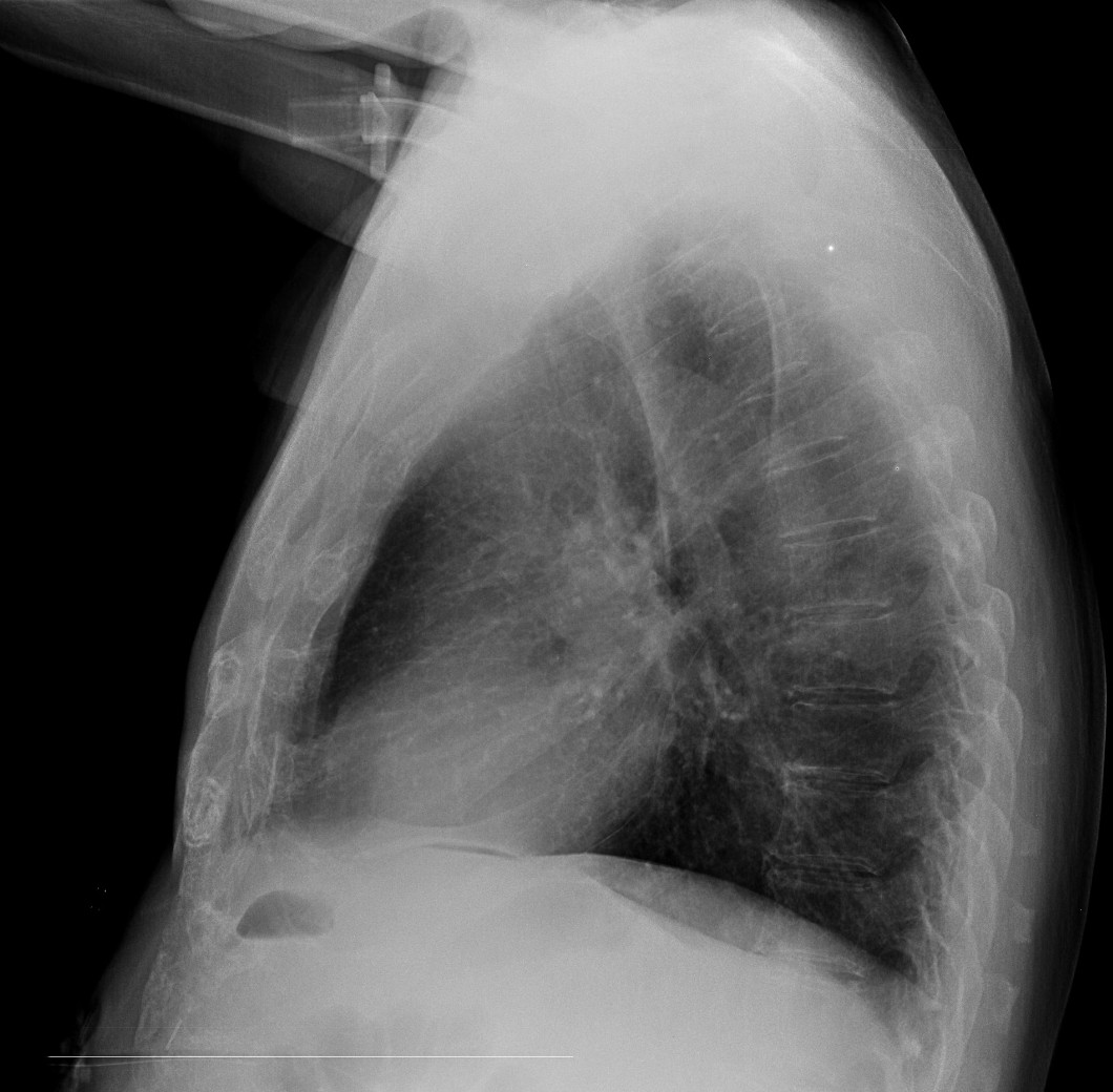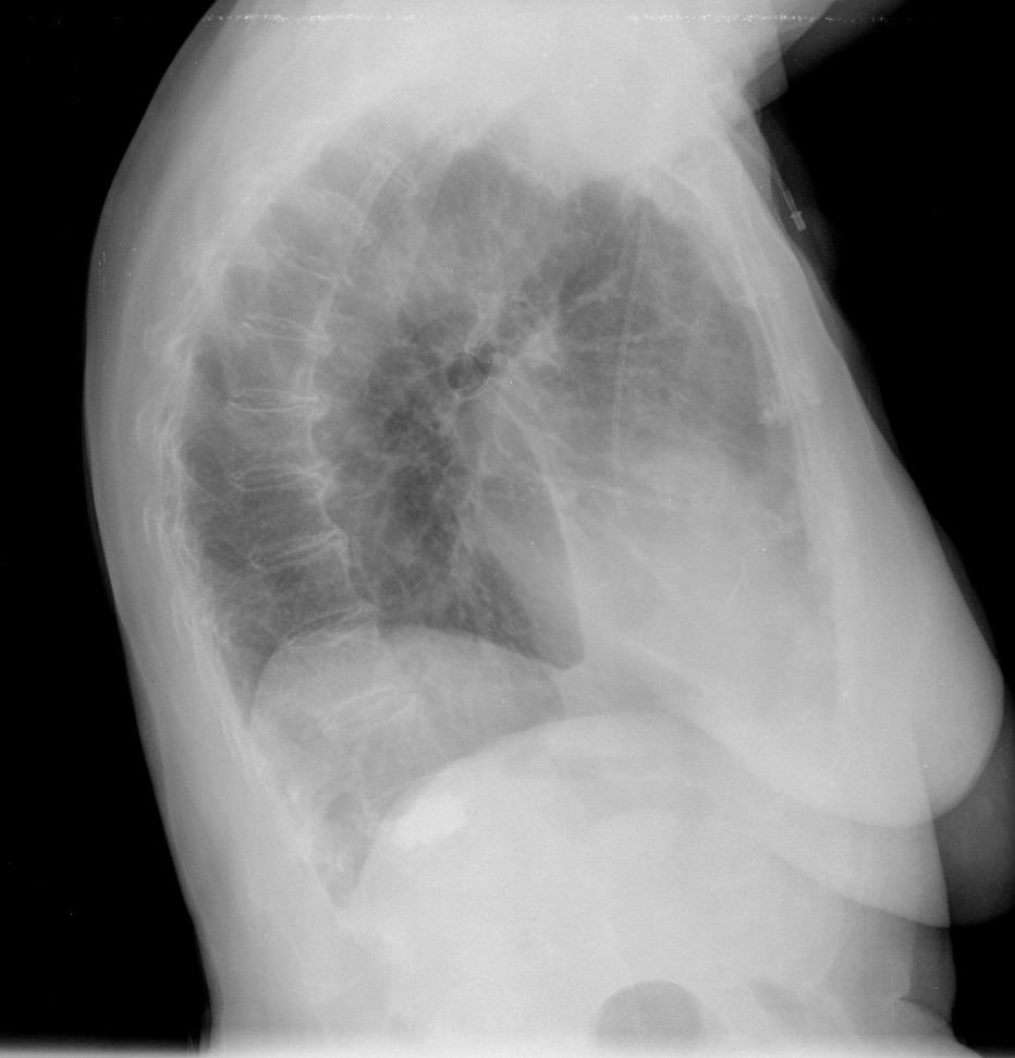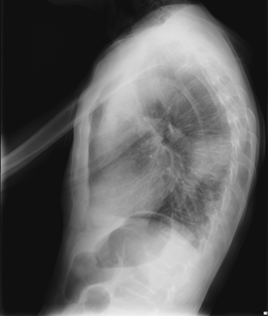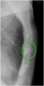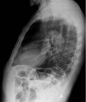 La imágen nodular, mejor visualizada en la placa lateral, ¿podría ser un proceso neoformativo? Pues podría, pero no lo es, estamos ante un caso de Atelectasia Redonda, se define así: