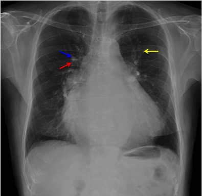 Ambas flechas señalan los pezones mamarios. Se observa que la imagen nodular es bilareral y en la placa lateral, es clara su posición en la glándula mamaria y no en el parénquima pulmonar. Cuando no lo tengamos claro, podemos recurrir a colocar un clip u otro objeto metálico sobre el pezón para así salir de dudas.