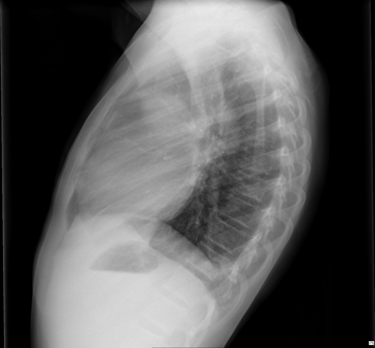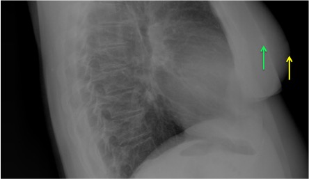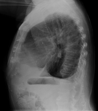- Borramiento del borde cardiaco derecho por pectus excavatum. En la placa lateral se observa la depresión interna del esternón y el apéndice xifoides.