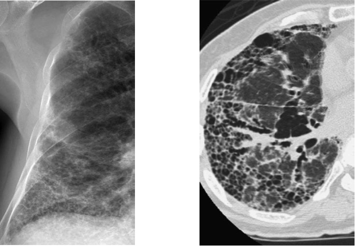 - Paciente con signos de EPOC tipo enfisema y tractos fibrosos: fibroenfisema.
