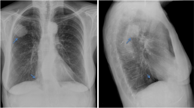 NOTA: Un nódulo pulmonar intraparenquimatoso es visible en las dos proyecciones de la placa simple, conservando su morfología y diámetros.