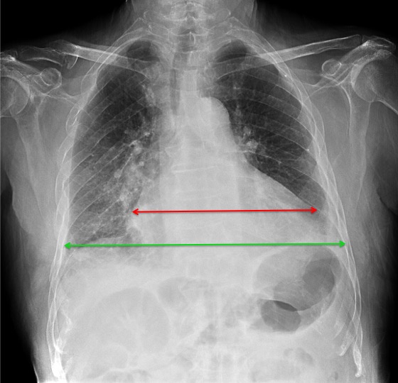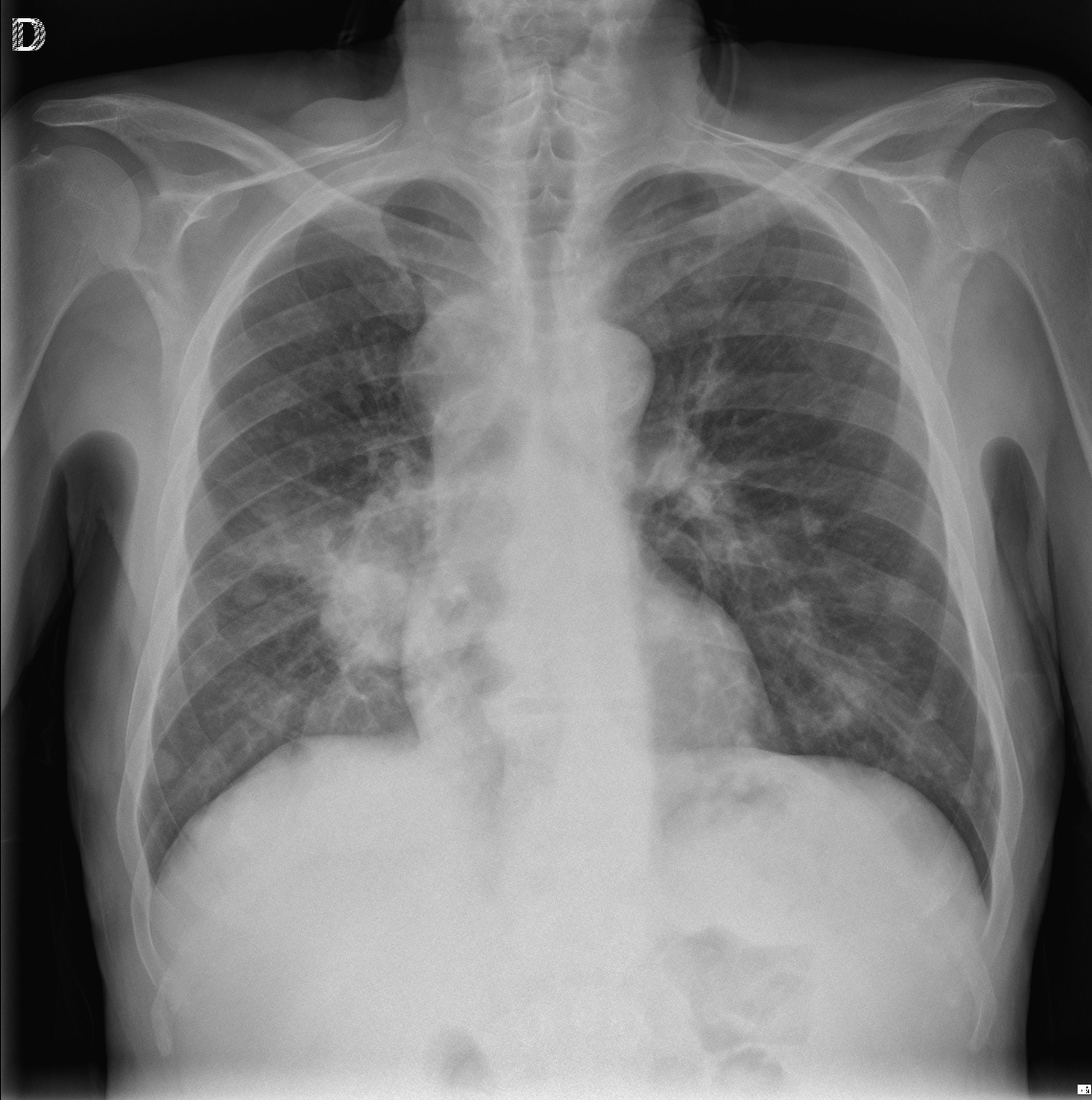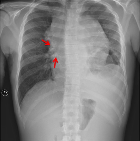 - Se observa un ensanchamiento mediastínico a expensas de una masa que desciende el hemidiafragma y borra el borde derecho del corazón.