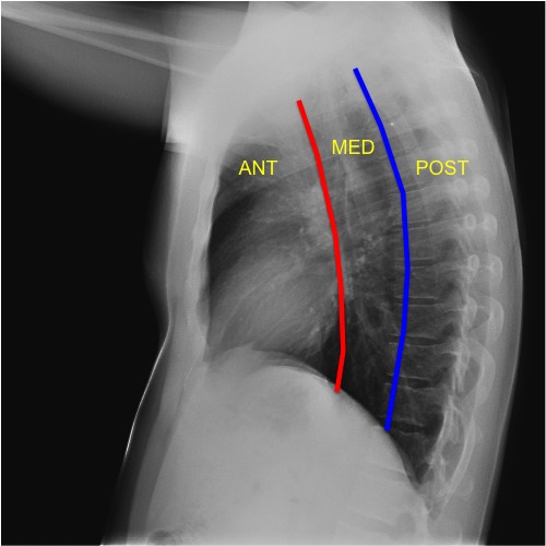 - En la placa lateral el compartimento anterior y medio se separa dibujando una línea imaginaria anterior a la tráquea y posterior a la vena cava.