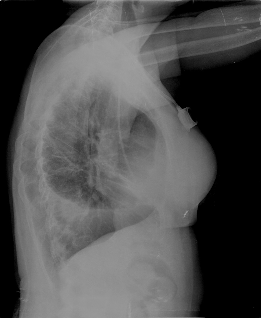 - Prótesis mamaria izquierda (obsevar el aumento de densidad homogéneo y de bordes bien definidos en la placa PA y lateral)