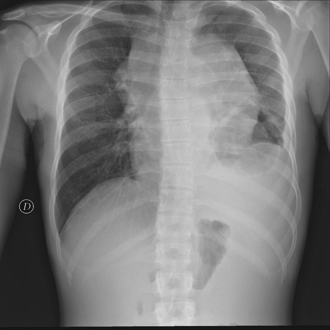 - De inicio llama la atención una densidad practicamente total del todo el hemitórax izquierdo, lo cual podría hacernos pensar que estamos ante una posible neumonía.