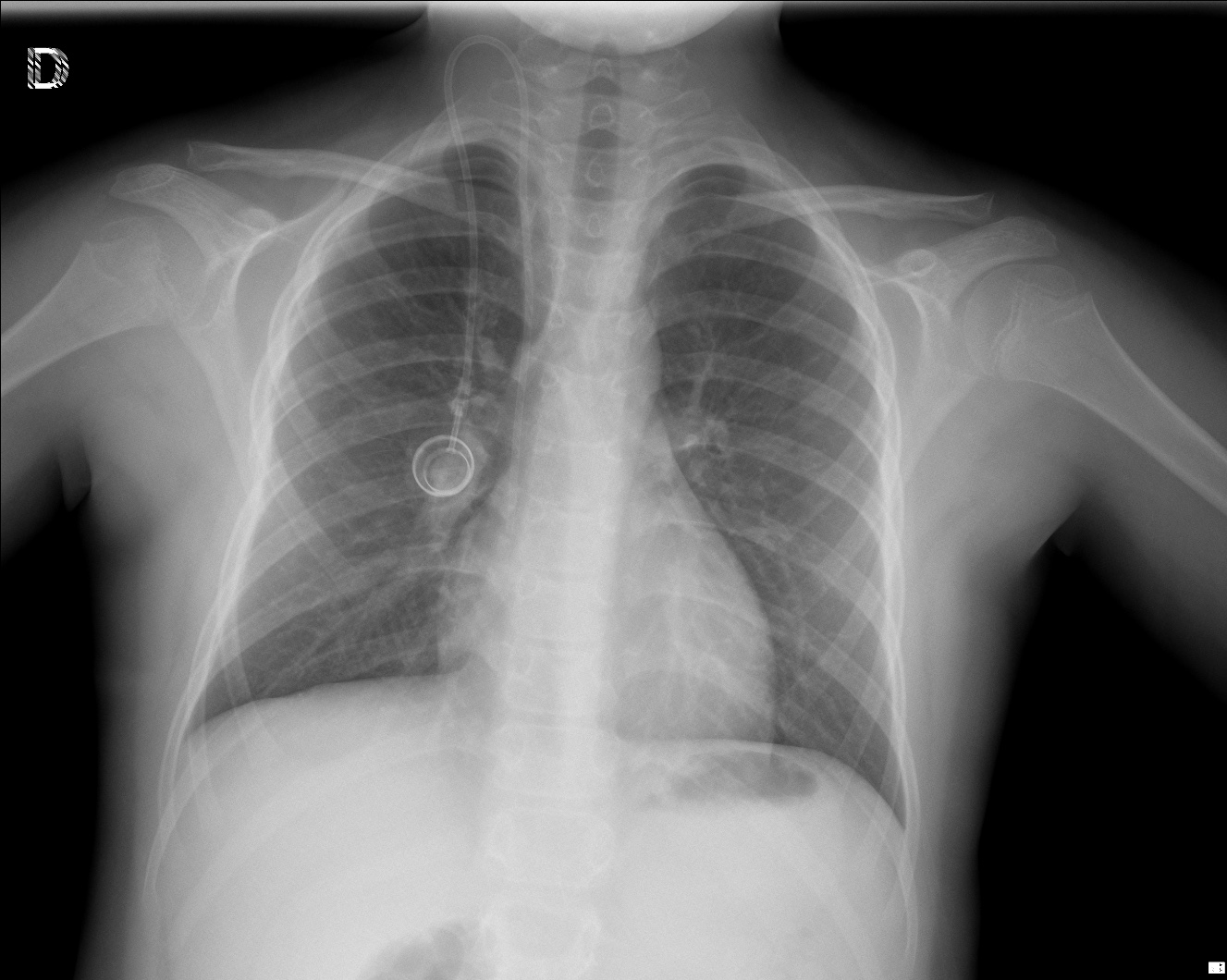 - Catéter reservorio en hemitórax derecho con extremo en vena cava superior.