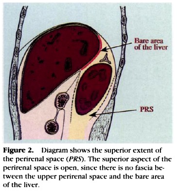 Límite superior: fascia renal posterior se fusiona con la porción posterolateral del diafragma y, en el lado derecho, se une al ligamento coronario inferior. La fascia renal anterior asciende hasta el diafragma sin llegar a cubrir el riñón y la suprarrenal, por lo que el espacio queda abierto al área desnuda del hígado, al diafragma y al mediastino, a través de los forámenes principales y accesorios.