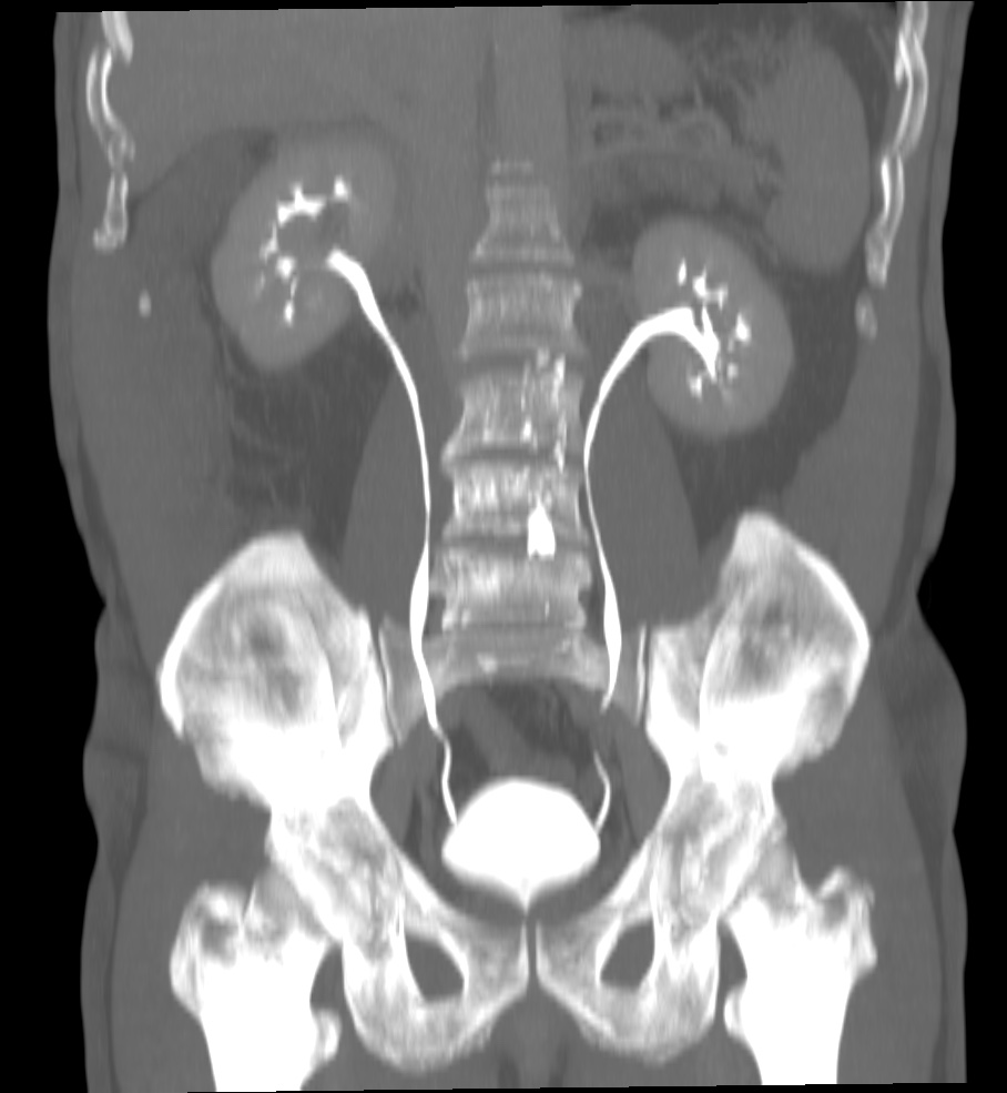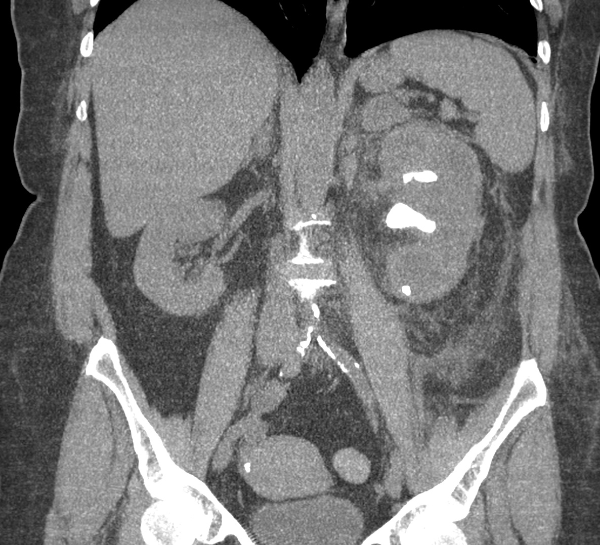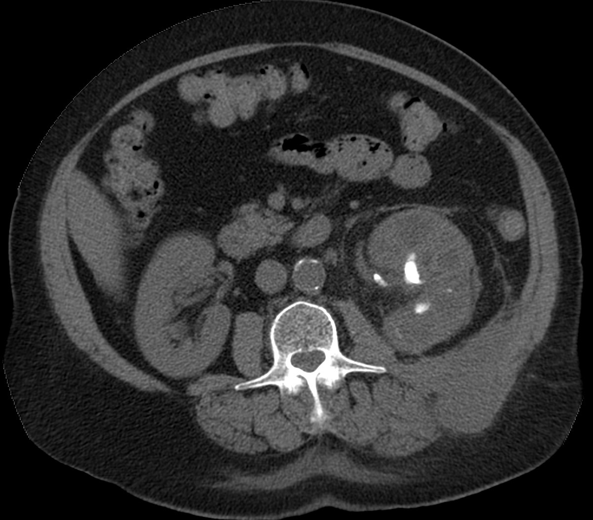 - Si son crónicos, los urinomas con el tiempo pueden descender siguiendo los límites del EPR y pueden presentan cápsula fibrosa que se realza con contraste en el TAC y que rodea al riñóm, simulando una nefromegalia.