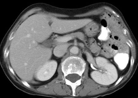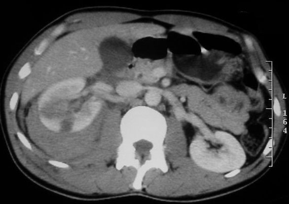 - TC: masa bien delimitada, encapsulada, con contenido líquido denso y pared que se realza con contraste. Puede existir gas. Alrededor se ven septos engrosados y aumento de la densidad de la grasa perirrenal.