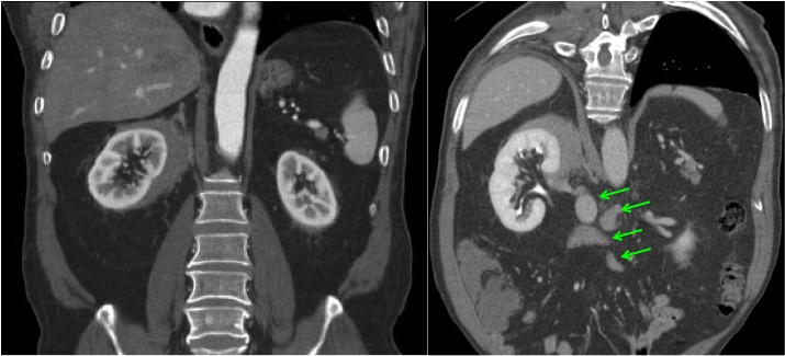 Inserciones diafragmáticas engrosadas cruzan el espacio perirrenal simulando una banda o un nódulo. Pueden reconocerse por su trayecto lineal, y a veces son necesarias reconstrucciones multiplanares. Constituyen una variante de la normalidad.