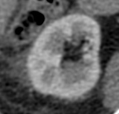 - Áreas hipodensas o hipoecogénicas dentro de la lesión renal debidas a cálices dilatados, abscesos o áreas de necrosis parenquimatosa.