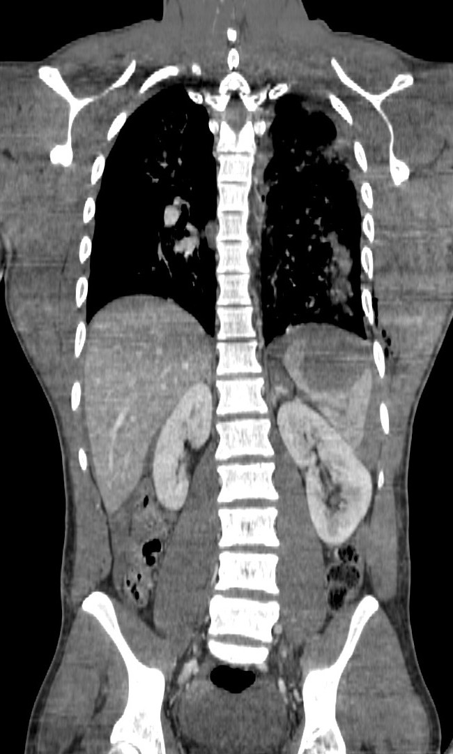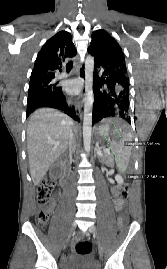 Ante estos hallazgos, estamos ante un traumatismo esplénico grado III. Con la edad del paciente y los indicios de inestabilidad hemodinámica, se decidió tratamiento mediante embolización arterial.